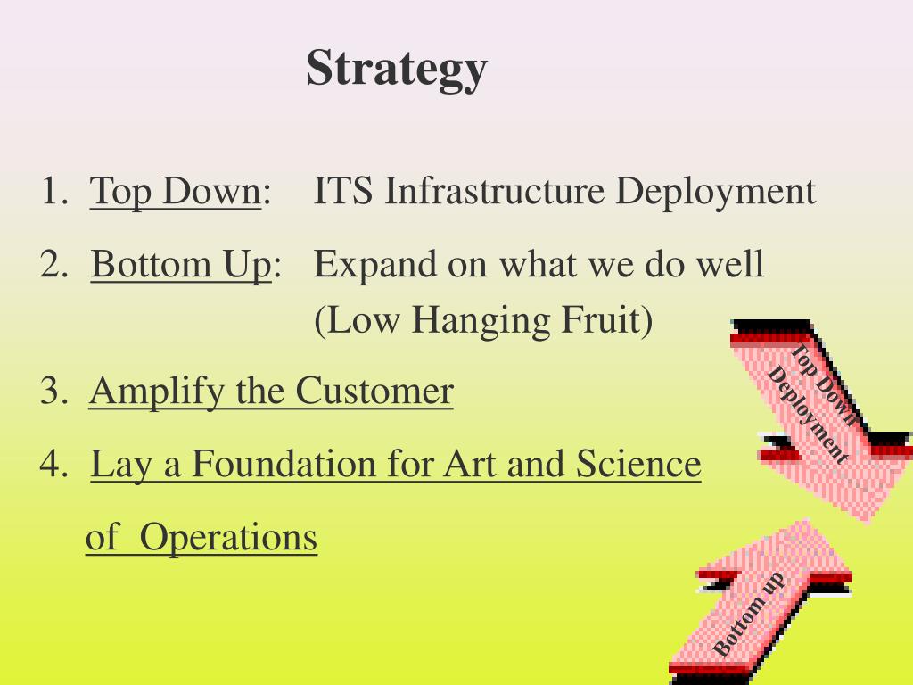 Strategy • 1. Top Down: ITS Infrastructure Deployment • 2. Bottom Up: Expand on what we do well • (Low Hanging Fruit) • 3. Amplify the Customer • 4. Lay a Foundation for Art and Science • of Operations Top Down Deployment Bottom up