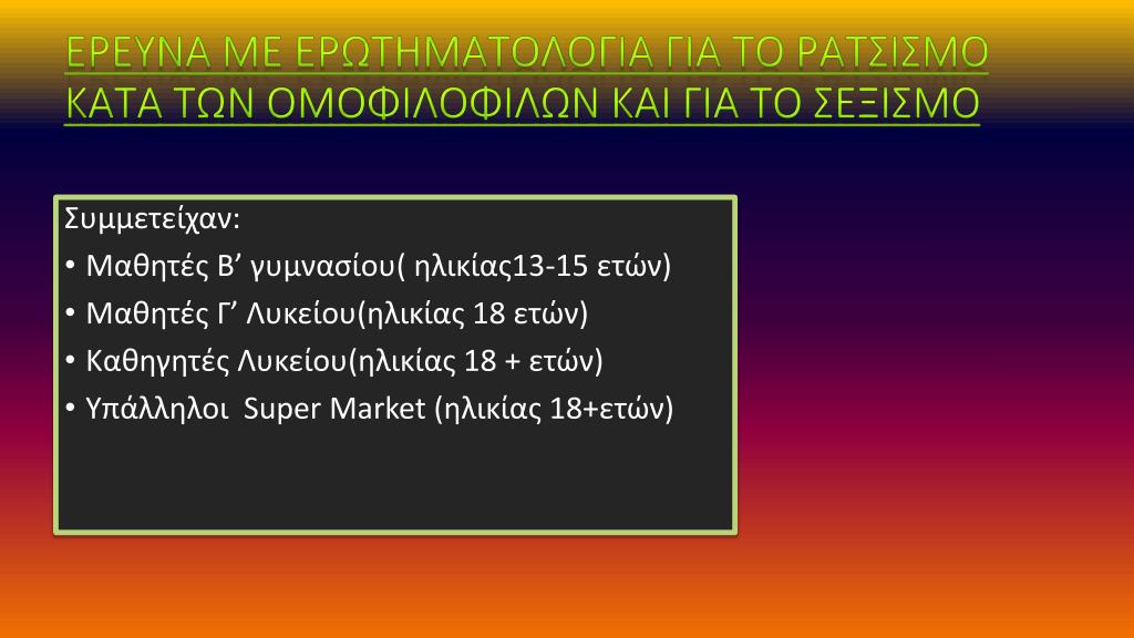 ΕΡΕΥΝΑ ΜΕ ΕΡΩΤΗΜΑΤΟΛΟΓΙΑ ΓΙΑ ΤΟ ΡΑΤΣΙΣΜΟ ΚΑΤΑ ΤΩΝ ΟΜΟΦΙΛΟΦΙΛΩΝ ΚΑΙ ΓΙΑ ΤΟ ΣΕΞΙΣΜΟ Συμμετείχαν: • Μαθητές Β’γυμνασίου( ηλικίας13-15 ετών) • Μαθητές Γ’Λυκείου(ηλικίας 18 ετών) • Καθηγητές Λυκείου(ηλικίας 18 + ετών) • Υπάλληλοι Super Market (ηλικίας 18+ετών)