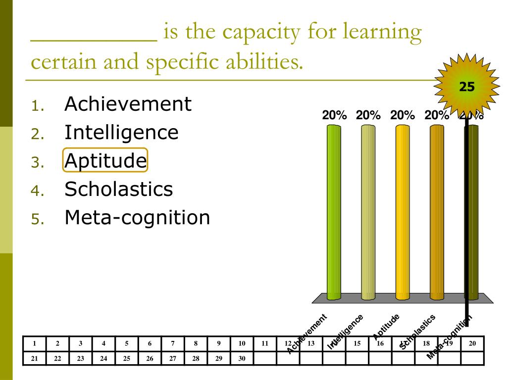 25 __________ is the capacity for learning certain and specific abilities. • Achievement • Intelligence • Aptitude • Scholastics • Meta-cognition