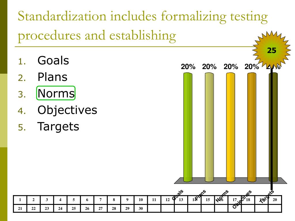 25 Standardization includes formalizing testing procedures and establishing • Goals • Plans • Norms • Objectives • Targets