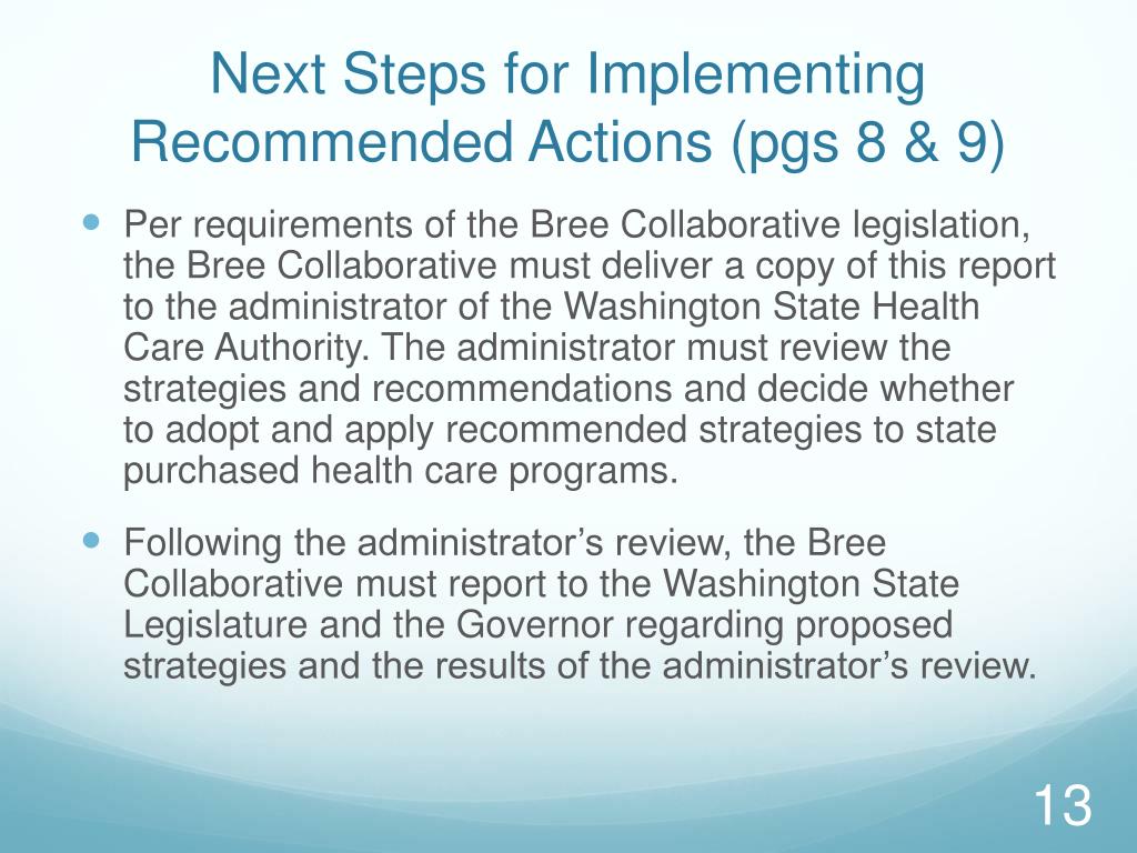 Next Steps for Implementing Recommended Actions (pgs 8 & 9) • Per requirements of the Bree Collaborative legislation, the Bree Collaborative must deliver a copy of this report to the administrator of the Washington State Health Care Authority. The administrator must review the strategies and recommendations and decide whether to adopt and apply recommended strategies to state purchased health care programs. • Following the administrator’s review, the Bree Collaborative must report to the Washington State Legislature and the Governor regarding proposed strategies and the results of the administrator’s review.