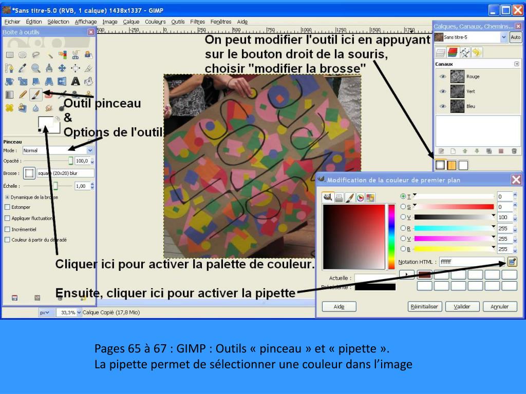Pages 65 à 67 : GIMP : Outils « pinceau » et « pipette ». La pipette permet de sélectionner une couleur dans l’image