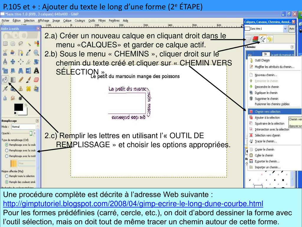 P.105 et + : Ajouter du texte le long d’une forme (2e ÉTAPE) 2.a) Créer un nouveau calque en cliquant droit dans le menu «CALQUES» et garder ce calque actif. 2.b) Sous le menu « CHEMINS », cliquer droit sur le chemin du texte créé et cliquer sur « CHEMIN VERS SÉLECTION ». 2.c) Remplir les lettres en utilisant l’« OUTIL DE REMPLISSAGE » et choisir les options appropriées. Une procédure complète est décrite à l’adresse Web suivante : http://gimptutoriel.blogspot.com/2008/04/gimp-ecrire-le-long-dune-courbe.html Pour les formes prédéfinies (carré, cercle, etc.), on doit d’abord dessiner la forme avec l’outil sélection, mais on doit tout de même tracer un chemin autour de cette forme.
