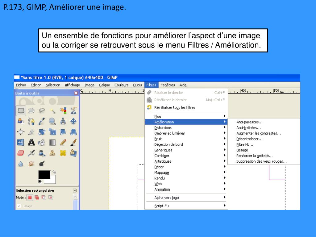 P.173, GIMP, Améliorer une image. Un ensemble de fonctions pour améliorer l’aspect d’une image ou la corriger se retrouvent sous le menu Filtres / Amélioration.