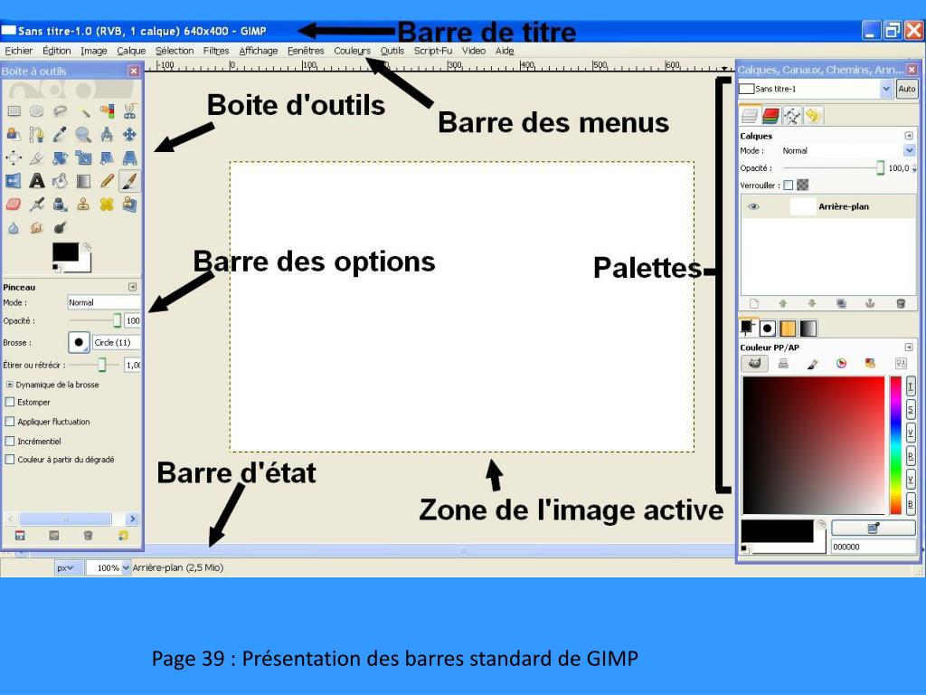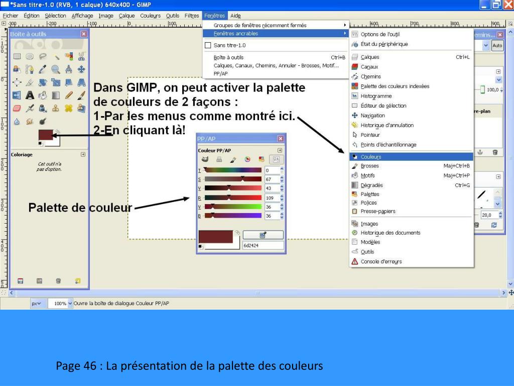 On peut activer la palette des couleurs en cliquant sur ce petit triangle Ensuite, on sélectionne « AJOUTER UN ONGLET » suivi de « COULEURS » Page 28 : Présentation de Gimp