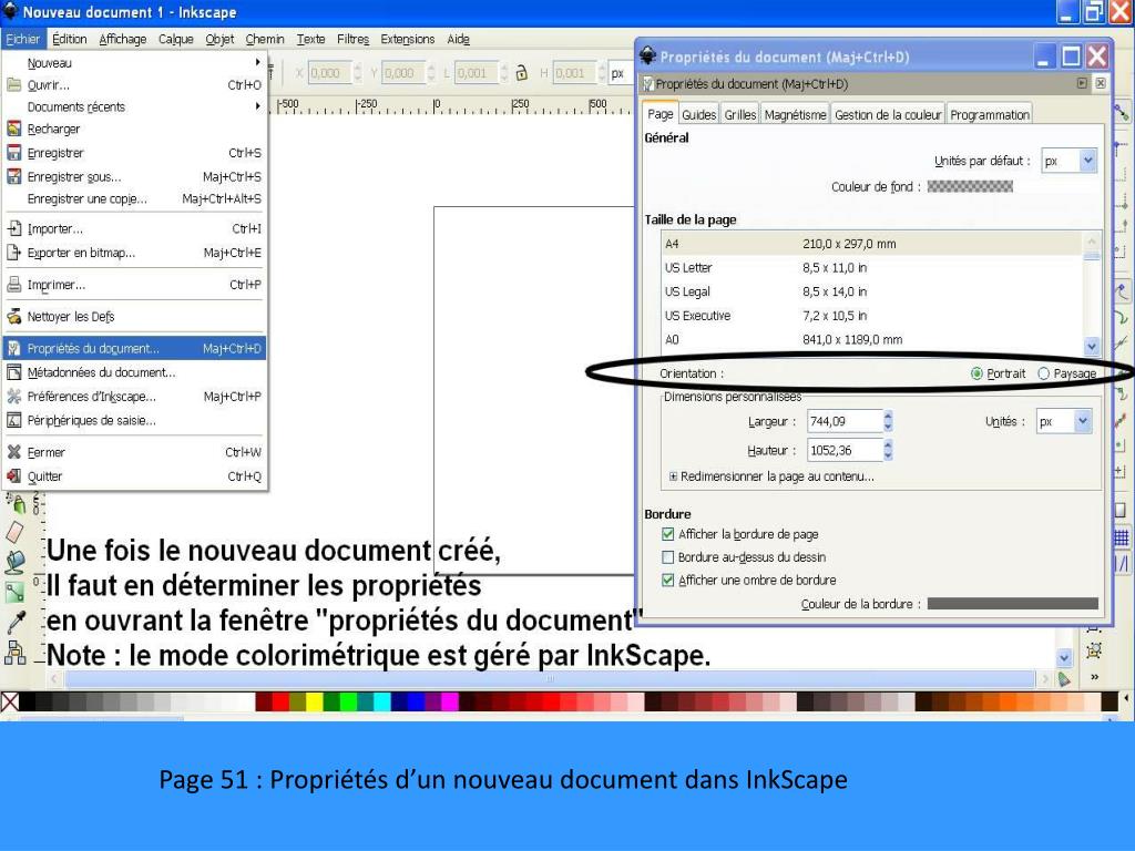 P.83+, InkScape : Outil de traçage de courbes et de lignes. 1.Sélectionnez l’outil de traçage 2.Ouvrez la fenêtre des options de traçage (taille du trait, couleurs, etc.) en cliquant sur « REMPLISSAGE » ou « CONTOUR »