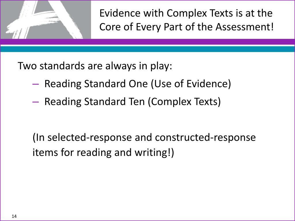 Evidence with Complex Texts is at the Core of Every Part of the Assessment! Two standards are always in play: • Reading Standard One (Use of Evidence) • Reading Standard Ten (Complex Texts) (In selected-responseand constructed-response items for reading and writing!)