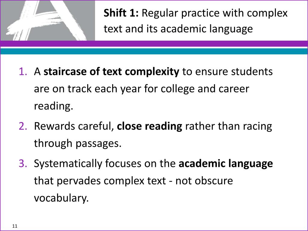 Shift 1: Regular practice with complex text and its academic language • Astaircase of text complexity to ensure students are on track each year for college and career reading. • Rewards careful, close reading rather than racing through passages. • Systematically focuses on the academic language that pervades complex text - not obscure vocabulary.