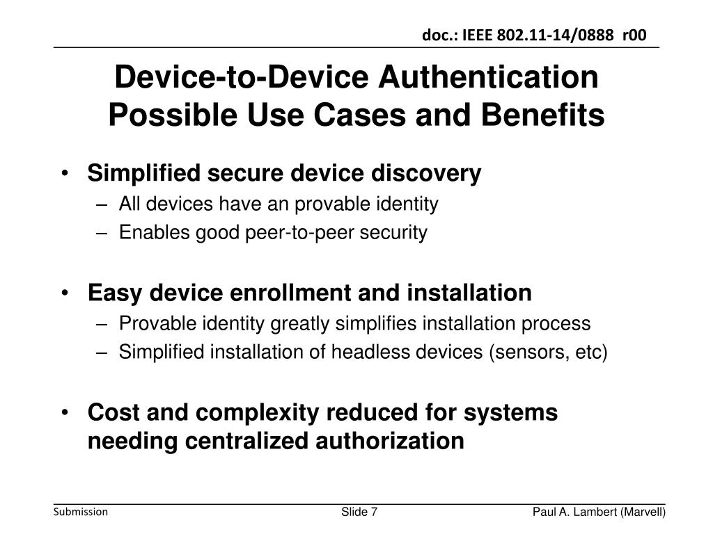 Simplified secure device discovery • All devices have an provable identity • Enables good peer-to-peer security • Easy device enrollment and installation • Provable identity greatly simplifies installation process • Simplified installation of headless devices (sensors, etc) • Cost and complexity reduced for systems needing centralized authorization Device-to-Device AuthenticationPossible Use Cases and Benefits Paul A. Lambert (Marvell)