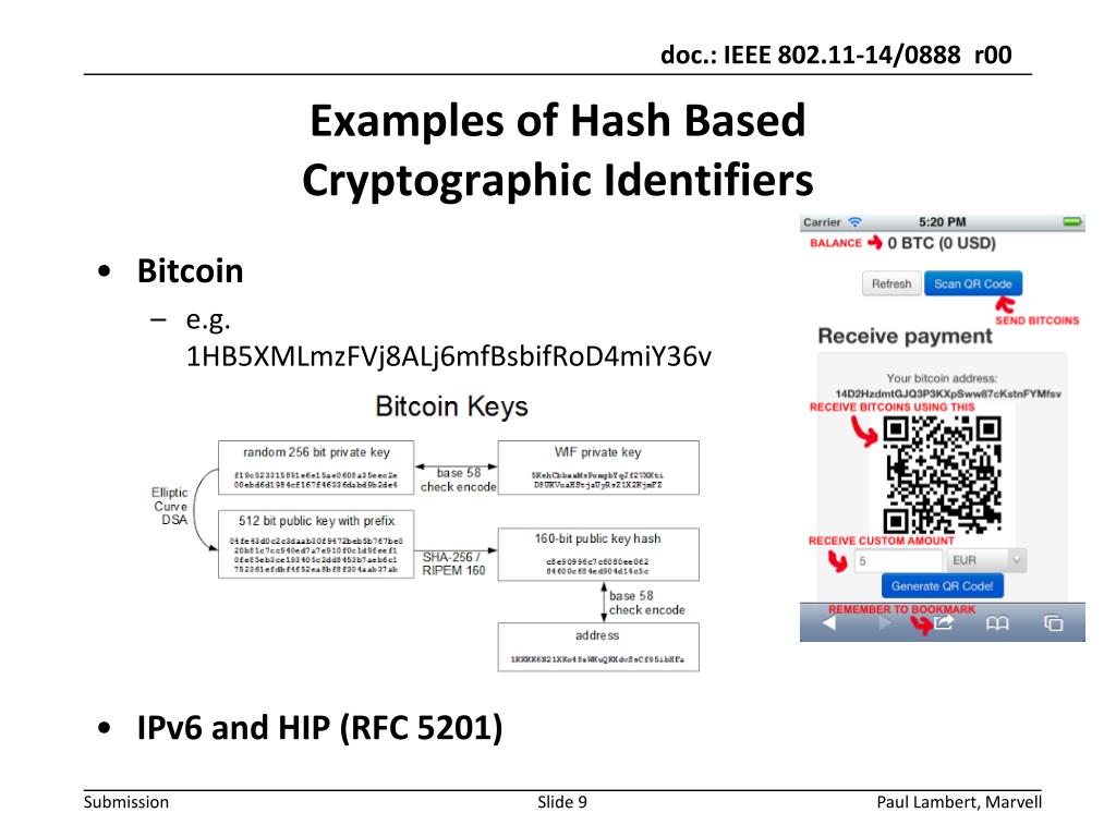 Bitcoin • e.g.1HB5XMLmzFVj8ALj6mfBsbifRoD4miY36v • IPv6 and HIP (RFC 5201) Examples of Hash Based Cryptographic Identifiers Paul Lambert, Marvell