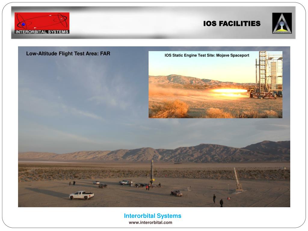 IOS FACILITIES Low-Altitude Flight Test Area: FAR IOS Static Engine Test Site: Mojave Spaceport InterorbitalSystems www.interorbital.com