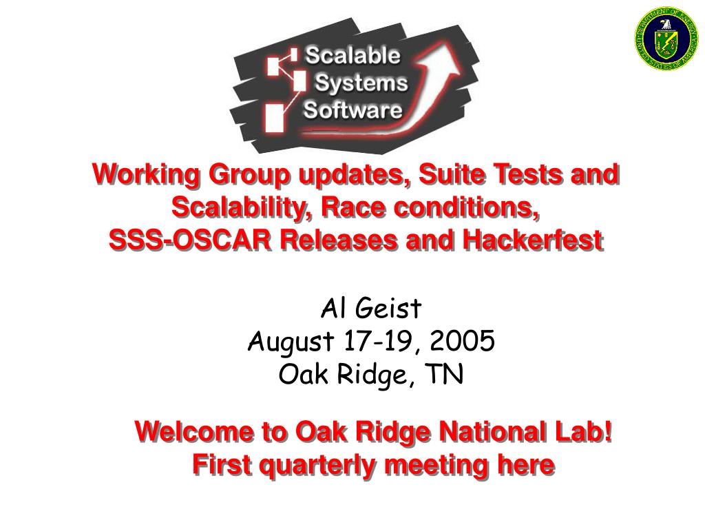 Working Group updates, Suite Tests and Scalability, Race conditions, SSS-OSCAR Releases and Hackerfest Al Geist August 17-19, 2005 Oak Ridge, TN Welcome to Oak Ridge National Lab!First quarterly meeting here