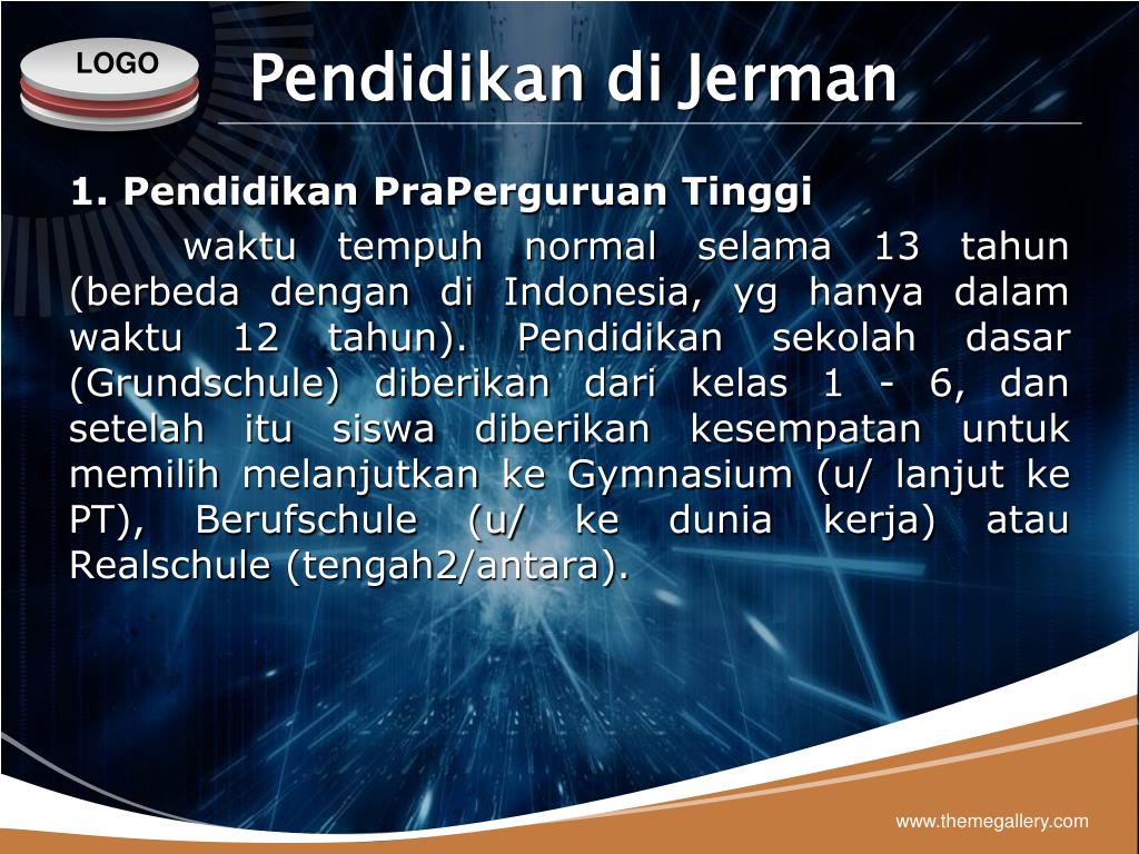 Pendidikan di Jerman 1. Pendidikan PraPerguruan Tinggi waktu tempuh normal selama 13 tahun (berbeda dengan di Indonesia, yghanya dalam waktu 12 tahun). Pendidikan sekolah dasar (Grundschule) diberikan dari kelas 1 - 6, dan setelah itu siswa diberikan kesempatan untuk memilih melanjutkan ke Gymnasium (u/ lanjut ke PT), Berufschule (u/ ke dunia kerja) atau Realschule (tengah2/antara). www.themegallery.com