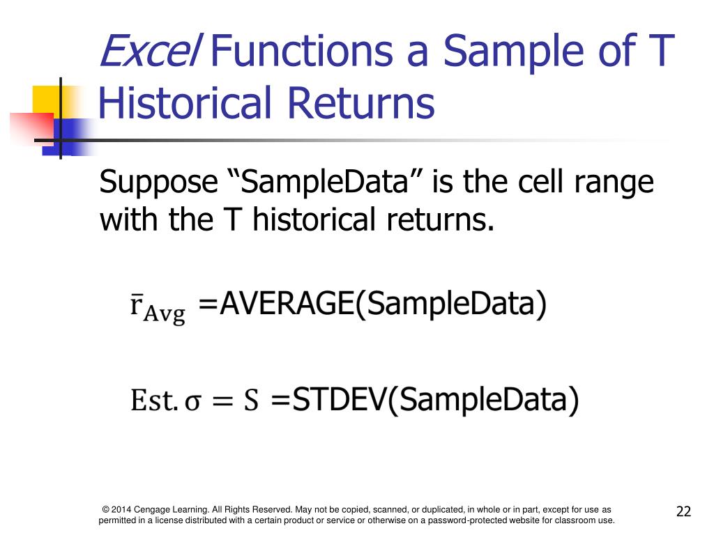 Excel Functions a Sample of T Historical Returns Suppose “SampleData” is the cell range with the T historical returns.