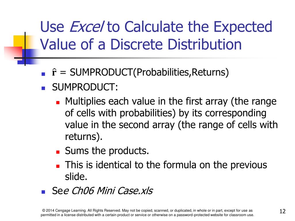 Use Excel to Calculate the Expected Value of a Discrete Distribution • SUMPRODUCT: • Multiplies each value in the first array (the range of cells with probabilities) by its corresponding value in the second array (the range of cells with returns). • Sums the products. • This is identical to the formula on the previous slide. • See Ch06 Mini Case.xls