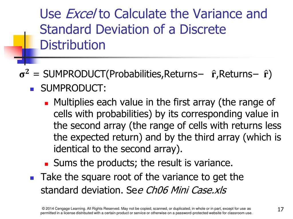 Use Excel to Calculate the Variance and Standard Deviation of a Discrete Distribution • SUMPRODUCT: • Multiplies each value in the first array (the range of cells with probabilities) by its corresponding value in the second array (the range of cells with returns less the expected return) and by the third array (which is identical to the second array). • Sums the products; the result is variance. • Take the square root of the variance to get the standard deviation. See Ch06 Mini Case.xls
