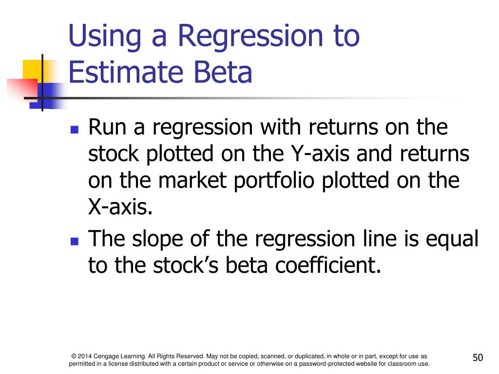 Using a Regression to Estimate Beta • Run a regression with returns on the stock plotted on the Y-axis and returns on the market portfolio plotted on the X-axis. • The slope of the regression line is equal to the stock’s beta coefficient.