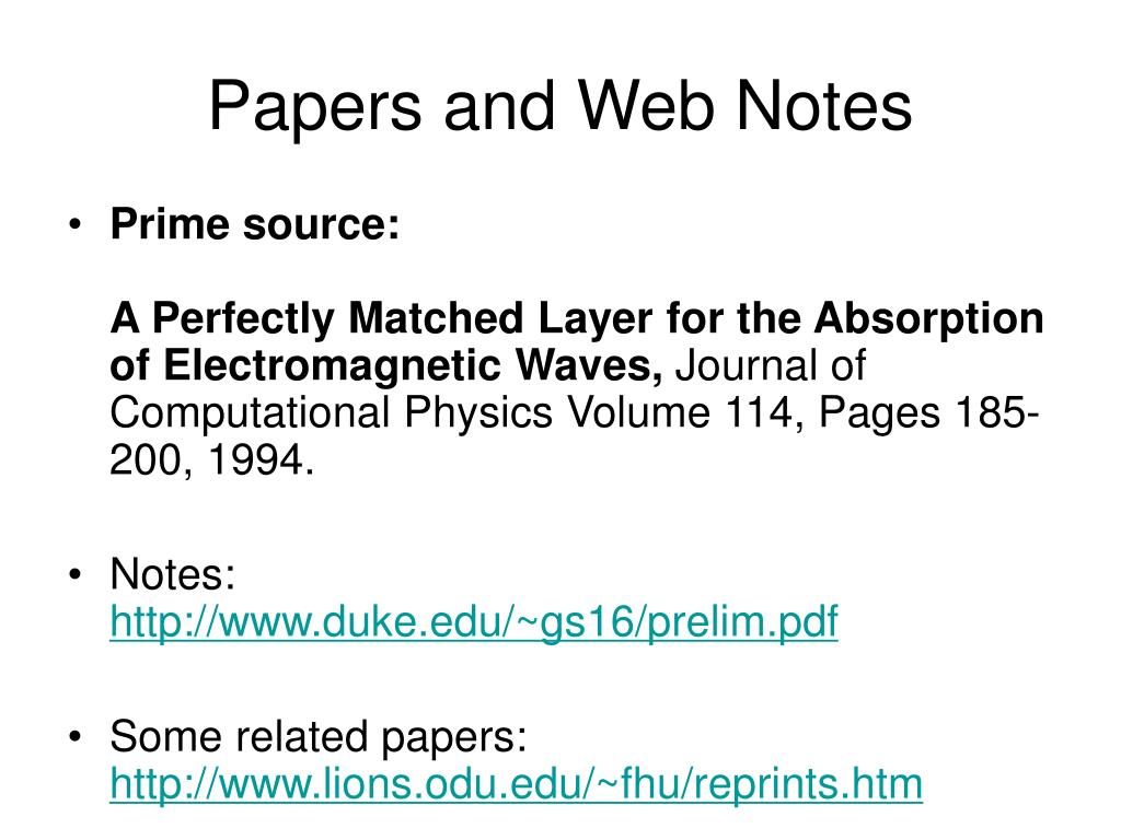 Papers and Web Notes • Prime source:A Perfectly Matched Layer for the Absorption of Electromagnetic Waves, Journal of Computational Physics Volume 114, Pages 185-200, 1994. • Notes:http://www.duke.edu/~gs16/prelim.pdf • Some related papers:http://www.lions.odu.edu/~fhu/reprints.htm • Misc: • Optimizing the perfectly matched layer,Computer Methods in Applied Mechanics and Engineering, Volume 164, Issues 1-2, October 1998, Pages 157-171