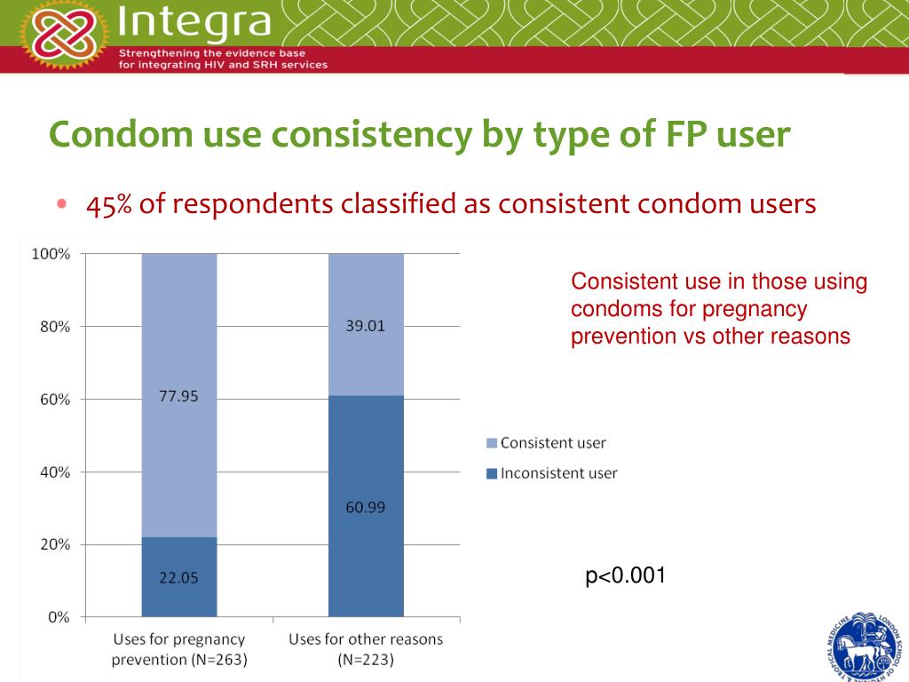 Condom use consistency by type of FP user 45% of respondents classified as consistent condom users Consistent use in those using condoms for pregnancy prevention vs other reasons p<0.001