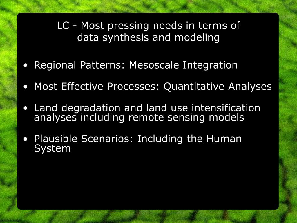 LC - Most pressing needs in terms of data synthesis and modeling • Regional Patterns: Mesoscale Integration • Most Effective Processes: Quantitative Analyses • Land degradation and land use intensification analyses including remote sensing models • Plausible Scenarios: Including the Human System