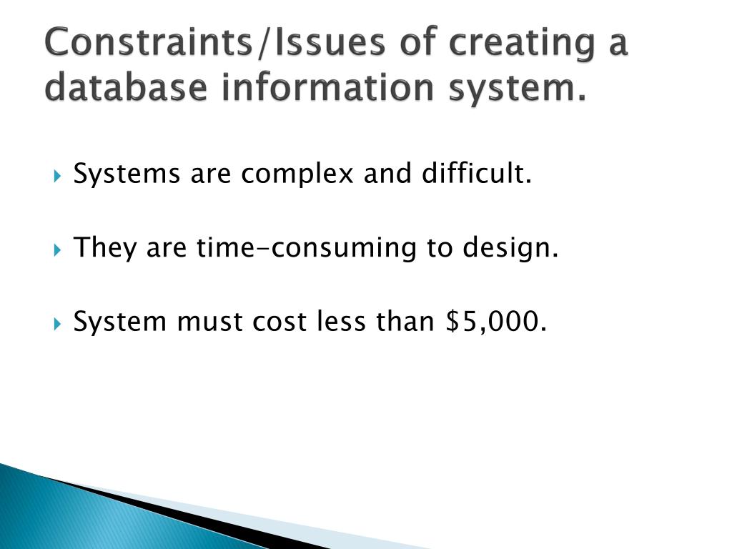 Constraints/Issues of creating a database information system. • Systems are complex and difficult. • They are time-consuming to design. • System must cost less than $5,000.
