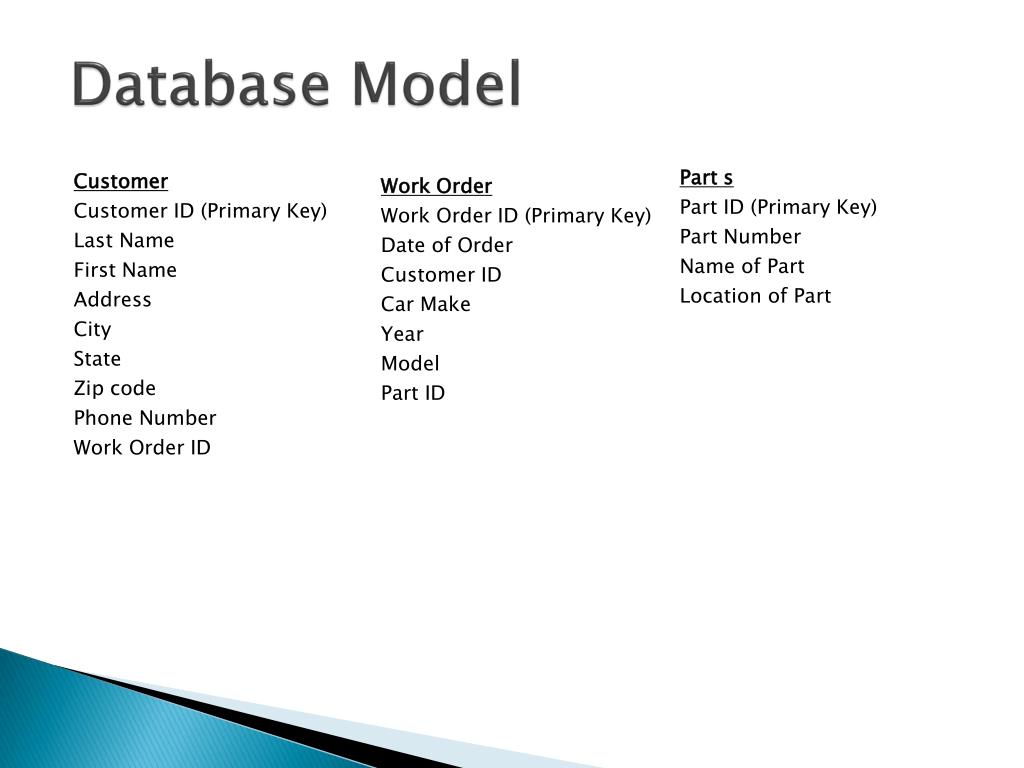 Database Model Part s Part ID (Primary Key) Part Number Name of Part Location of Part Customer Customer ID (Primary Key) Last Name First Name Address City State Zip code Phone Number Work Order ID Work Order Work Order ID (Primary Key) Date of Order Customer ID Car Make Year Model Part ID