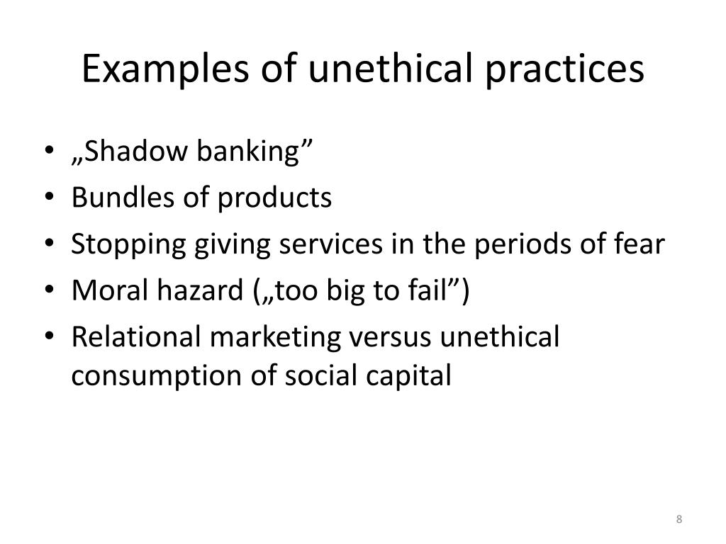 Examples of unethical practices • „Shadow banking” • Bundles of products • Stopping giving services in the periods of fear • Moral hazard („too big to fail”) • Relational marketing versusunethical consumption of social capital