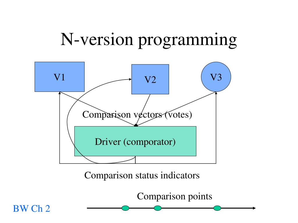 N-version programming V1 V3 V2 Comparison vectors (votes) Driver (comporator) Comparison status indicators Comparison points BW Ch 2