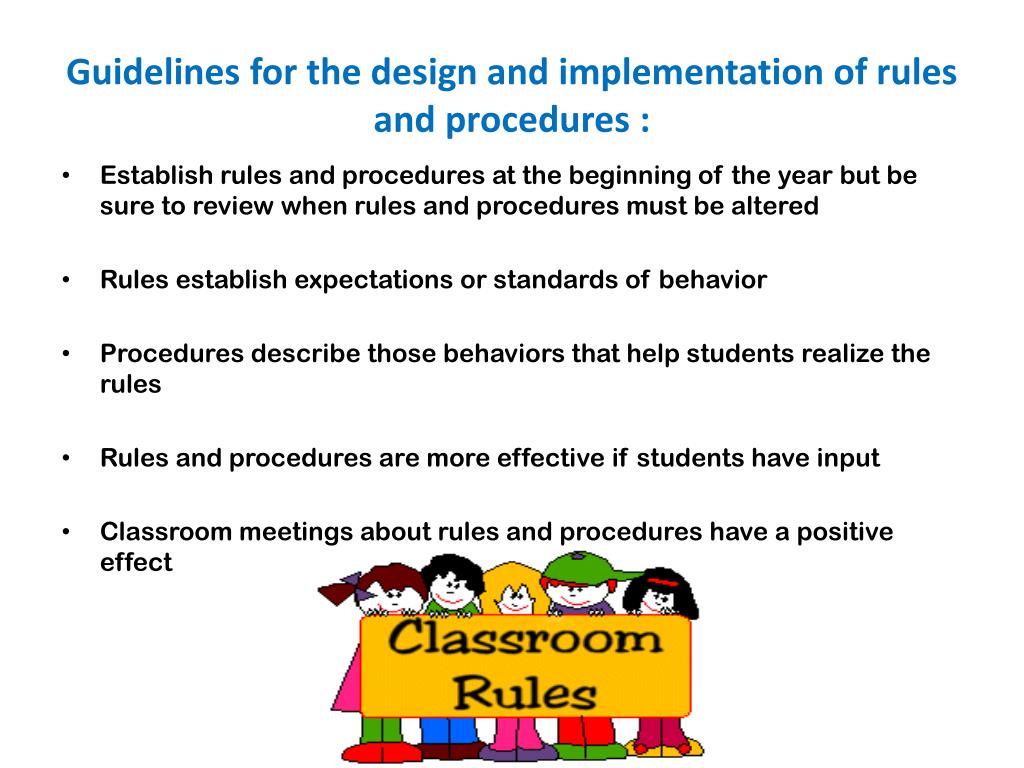Guidelines for the design and implementation of rules and procedures : • Establish rules and procedures at the beginning of the year but be sure to review when rules and procedures must be altered • Rules establish expectations or standards of behavior • Procedures describe those behaviors that help students realize the rules • Rules and procedures are more effective if students have input • Classroom meetings about rules and procedures have a positive effect