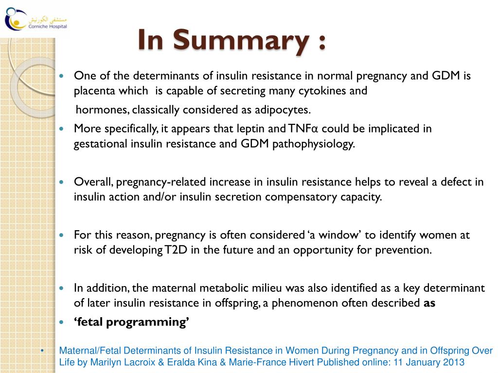 In Summary : • Maternal/Fetal Determinants of Insulin Resistance in Women During Pregnancy and in Offspring Over Life by Marilyn Lacroix & Eralda Kina & Marie-France Hivert Published online: 11 January 2013 One of the determinants of insulin resistance in normal pregnancy and GDM is placenta which is capable of secreting many cytokines and hormones, classically considered as adipocytes. More specifically, it appears that leptin and TNFα could be implicated in gestational insulin resistance and GDM pathophysiology. Overall, pregnancy-related increase in insulin resistance helps to reveal a defect in insulin action and/or insulin secretion compensatory capacity. For this reason, pregnancy is often considered ‘a window’ to identify women at risk of developing T2D in the future and an opportunity for prevention. In addition, the maternal metabolic milieu was also identified as a key determinant of later insulin resistance in offspring, a phenomenon often described as ‘fetal programming’