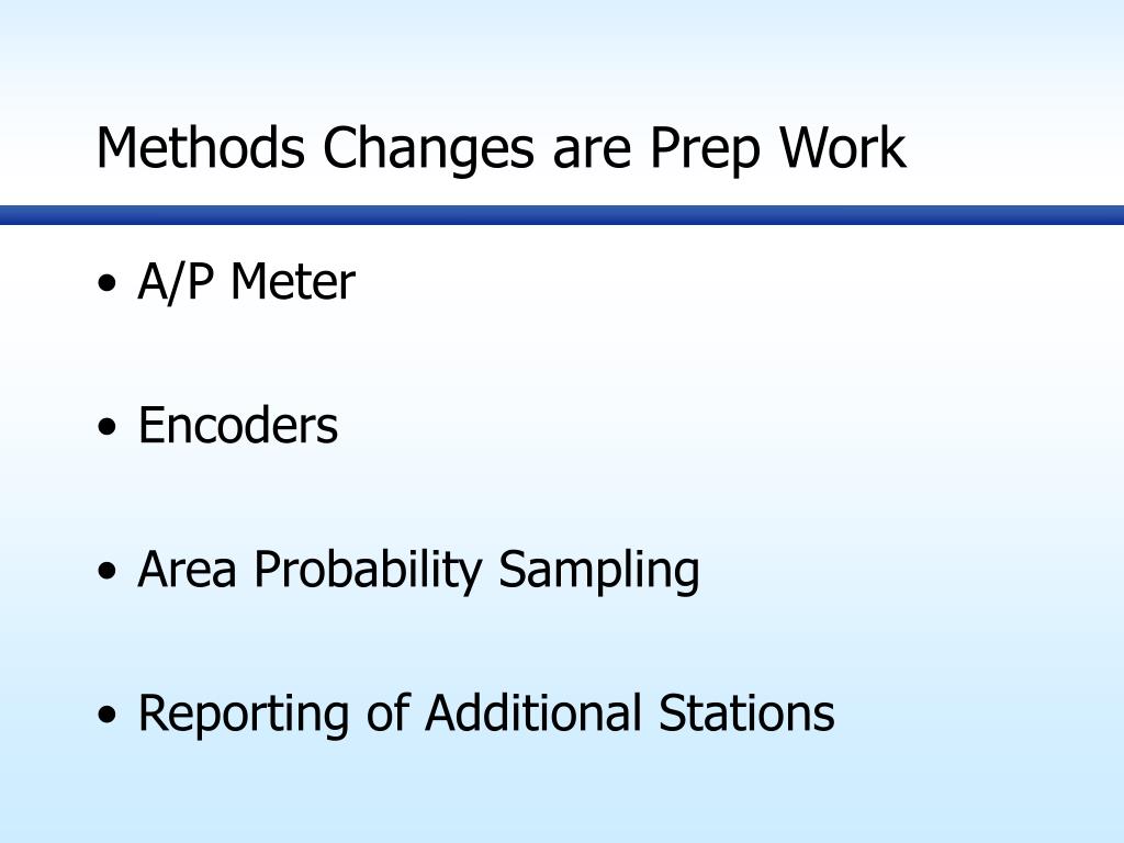 Methods Changes are Prep Work • A/P Meter • Encoders • Area Probability Sampling • Reporting of Additional Stations