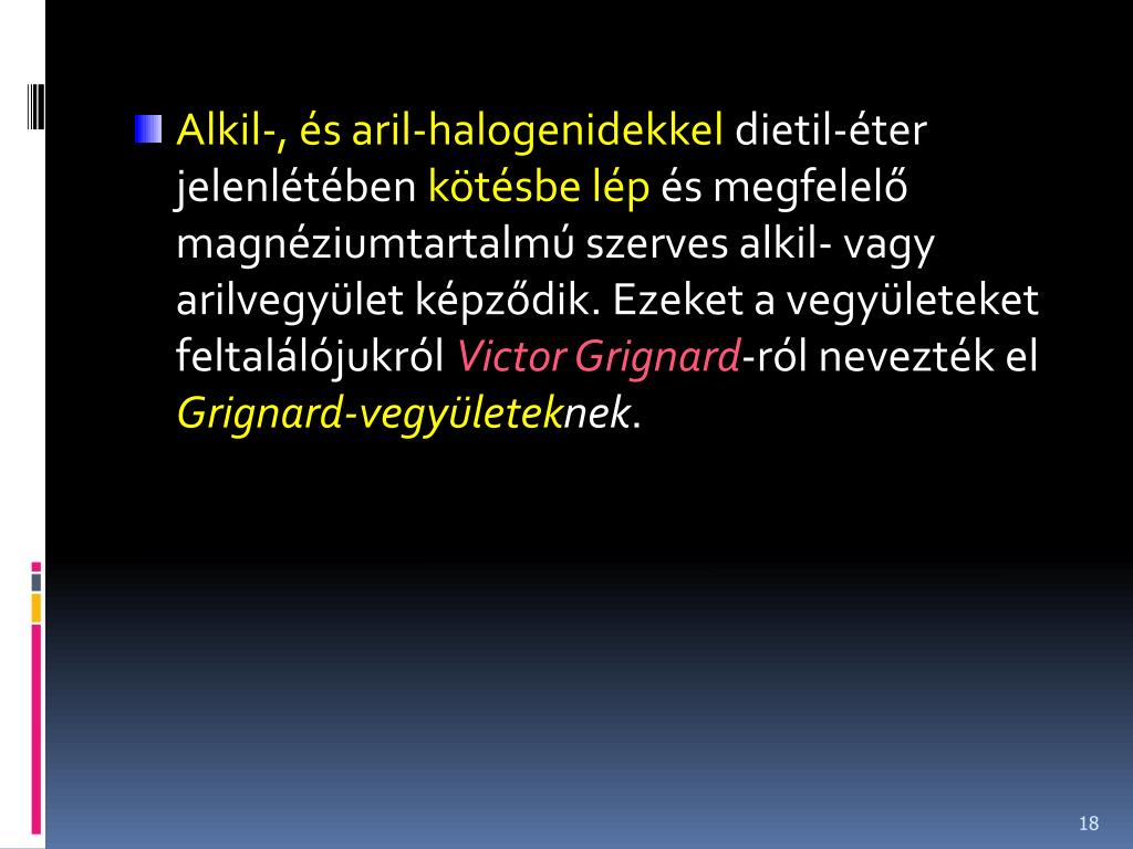 Alkil-, és aril-halogenidekkel dietil-éter jelenlétében kötésbe lép és megfelelő magnéziumtartalmú szerves alkil- vagy arilvegyület képződik. Ezeket a vegyületeket feltalálójukról Victor Grignard-ról nevezték el Grignard-vegyületeknek.