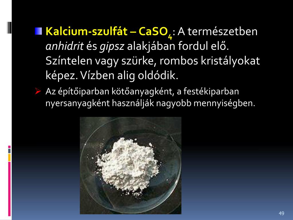 Kalcium-szulfát–CaSO4: A természetben anhidrit és gipsz alakjában fordul elő. Színtelen vagy szürke, rombos kristályokat képez. Vízben alig oldódik. • Az építőiparban kötőanyagként, a festékiparban nyersanyagként használják nagyobb mennyiségben.