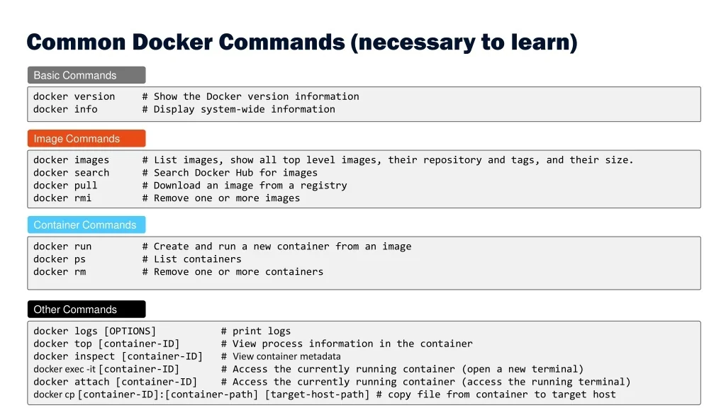 8. Common Docker Commands (necessary to learn) BasicCommands docker version # Show the Docker version information docker info # Display system-wide information ImageCommands docker images # List images, show all top level images, their repository and tags, and their size. docker search # Search Docker Hub for images docker pull # Download an image from a registry docker rmi # Remove one or more images ContainerCommands docker run # Create and run a new container from an image docker ps # List containers docker rm # Remove one or more containers OtherCommands docker logs [OPTIONS] # print logs docker top [container-ID] # View process information in the container docker inspect [container-ID] # View container metadata dockerexec-it [container-ID] # Access the currently running container (open a new terminal) docker attach [container-ID] # Access the currently running container (access the running terminal) docker cp [container-ID]:[container-path] [target-host-path] # copy file from container to target host