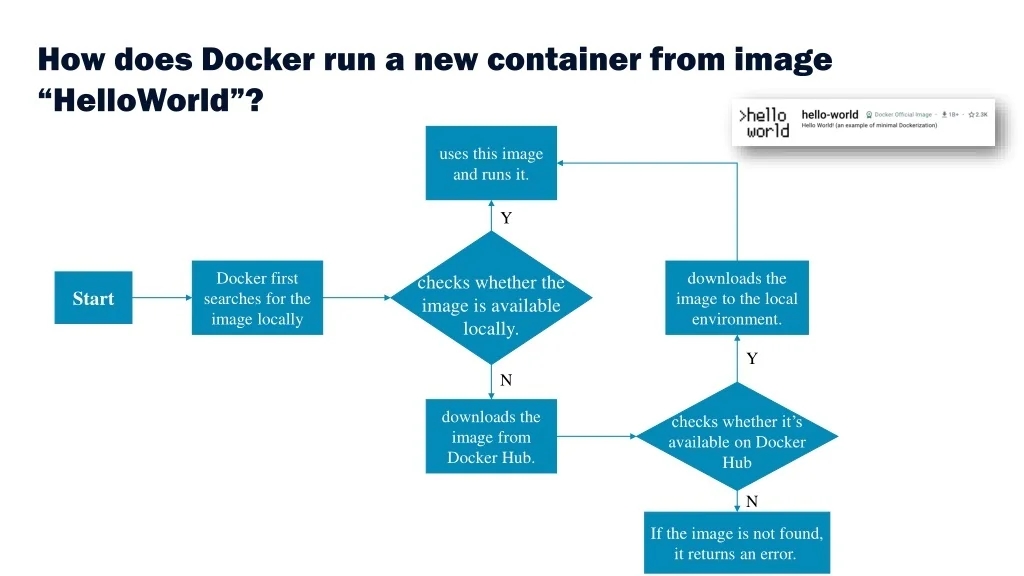 7. How does Dockerrun a new container from image “HelloWorld”? uses this image and runs it. Y Docker first searches for the image locally downloads the image to the local environment. Start checks whether the image is available locally. checks whether it’s available on Docker Hub Y N downloads the image from Docker Hub. N If the image is not found, it returns an error.