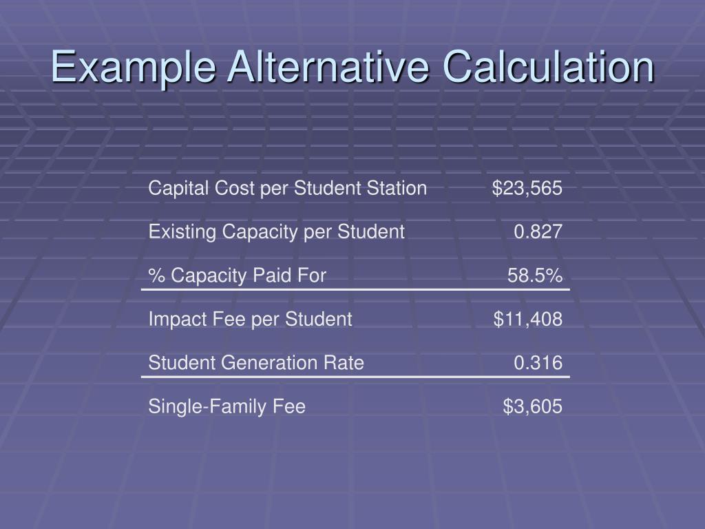 Alternative Approach • Base Fees on Existing, Paid-For LOS • Cost per Student = Cost/Station x Stations/Student – Outstanding Debt/Student • No Property Tax Credit Needed • No Existing Deficiencies • Level of Service Excludes Outstanding Debt • Any Discretionary CIT Expenditures for Capacity Raise LOS for all