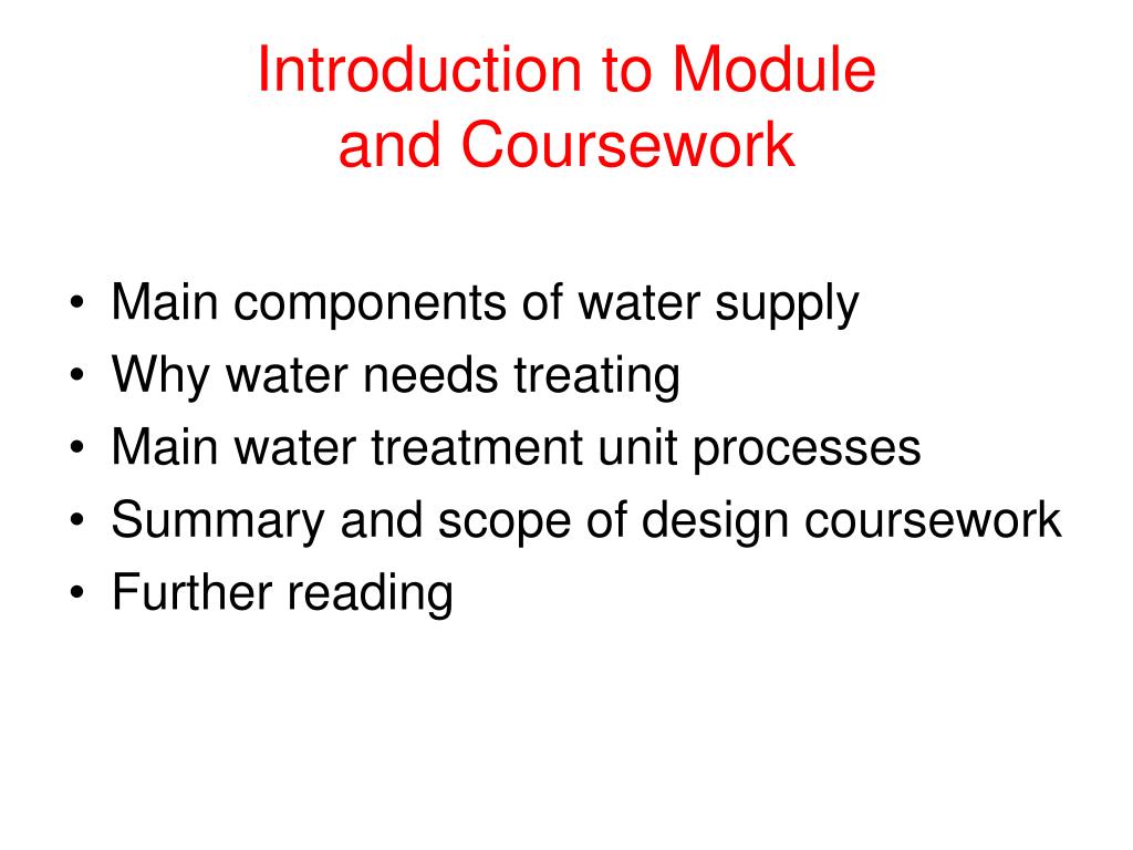 Introduction to Moduleand Coursework • Main components of water supply • Why water needs treating • Main water treatment unit processes • Summary and scope of design coursework • Further reading