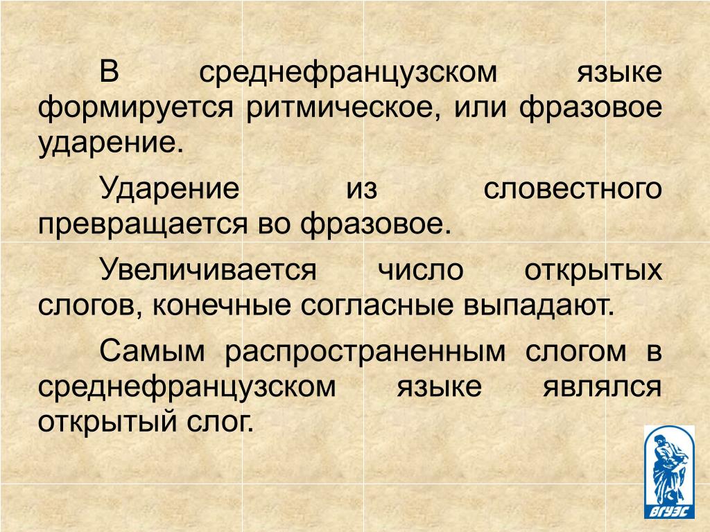 В среднефранцузском языке формируется ритмическое, или фразовое ударение. Ударение из словестного превращается во фразовое. Увеличивается число открытых слогов, конечные согласные выпадают. Самым распространенным слогом в среднефранцузском языке являлся открытый слог.
