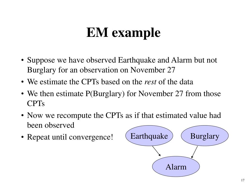 EM example • Suppose we have observed Earthquake and Alarm but not Burglary for an observation on November 27 • We estimate the CPTs based on the rest of the data • We then estimate P(Burglary) for November 27 from those CPTs • Now we recompute the CPTs as if that estimated value had been observed • Repeat until convergence! Earthquake Burglary Alarm