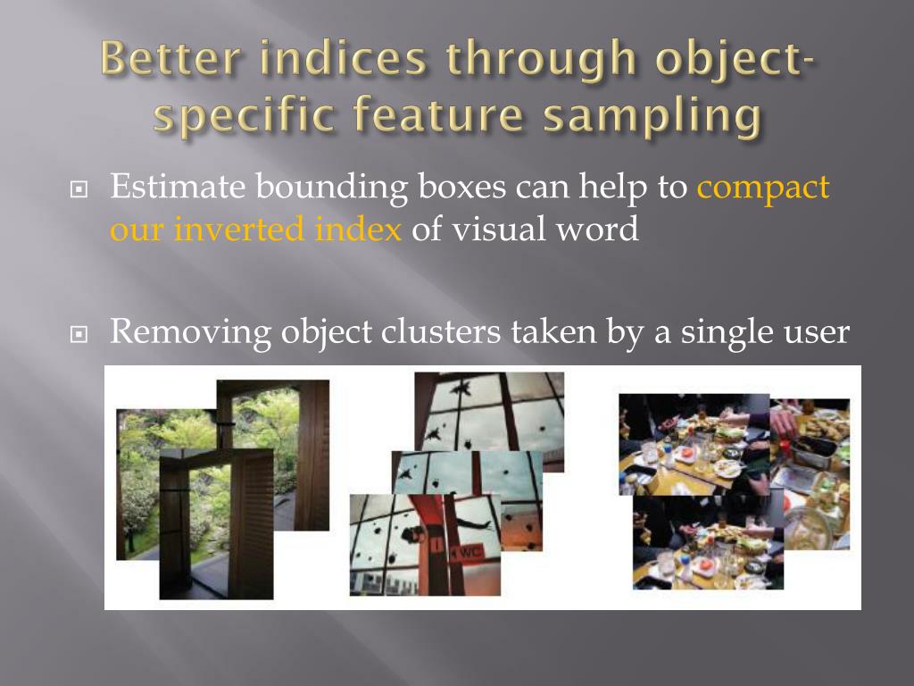 Better indices through object-specific feature sampling • Estimate bounding boxes can help to compact our inverted index of visual word • Removing object clusters taken by a single user