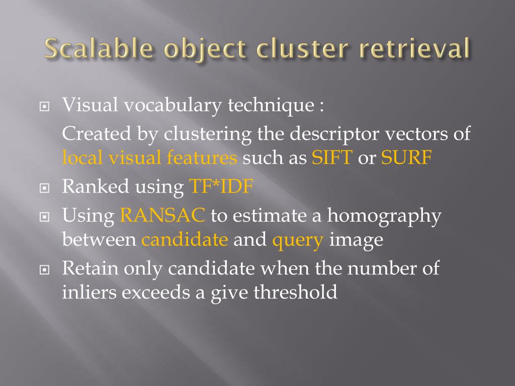 Scalable object cluster retrieval • Visual vocabulary technique : Created by clustering the descriptor vectors of local visual features such as SIFT or SURF • Ranked using TF*IDF • Using RANSAC to estimate a homography between candidateand queryimage • Retain only candidate when the number of inliers exceeds a give threshold