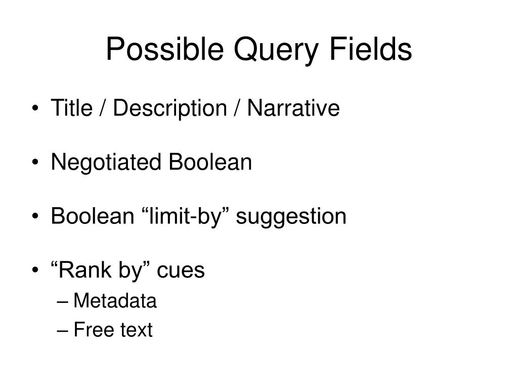 Possible Query Fields • Title / Description / Narrative • Negotiated Boolean • Boolean “limit-by” suggestion • “Rank by” cues • Metadata • Free text