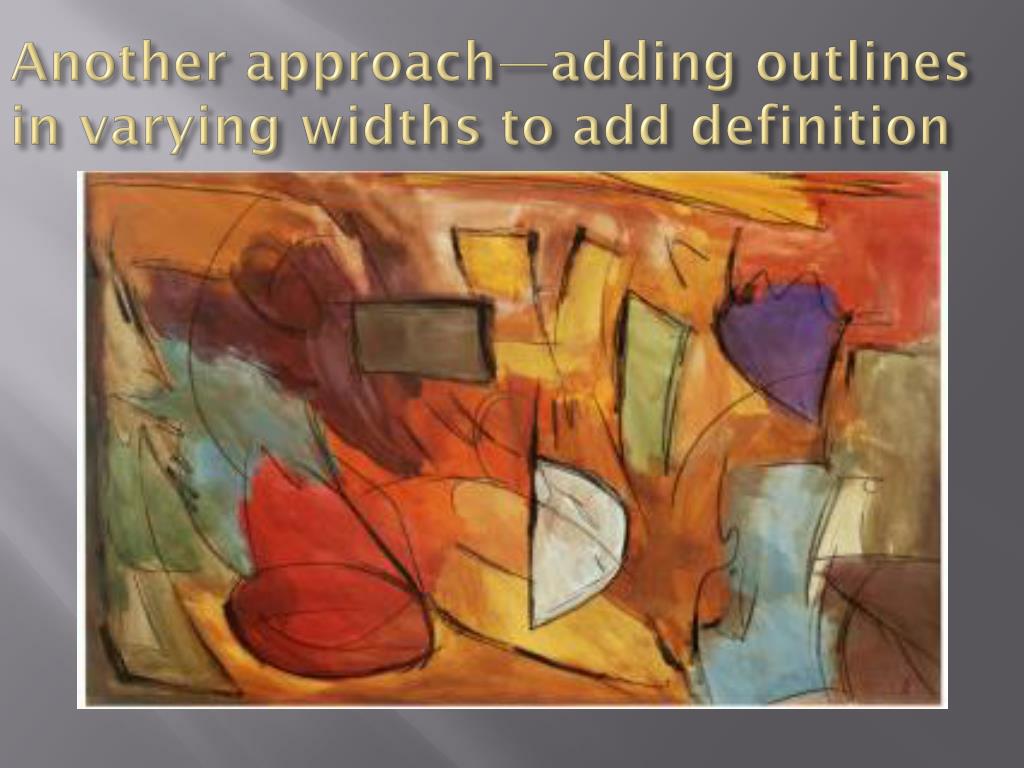 Approach #2Start with Nature Picasso said “There is no abstract art. You must always start with something. Afterward you can remove all traces of reality.” • Choose a realistic painting that you like. • Use a critique (photographic tic-tac-toe) grid format to reduce the painting to bare bones, simplifying the main shapes to lines and shapes. Forget about the “things” being shown, just indicate the main volumes - the rough shape of a figure, the vertical shape of a tree, a horizon. • Re-sketch what you have after reducing the design on a new page. Continue to simplify, emphasizing the shapes, lines and colors that you want to lead to your focal point. • Create unity but remember to add some variety for interest.