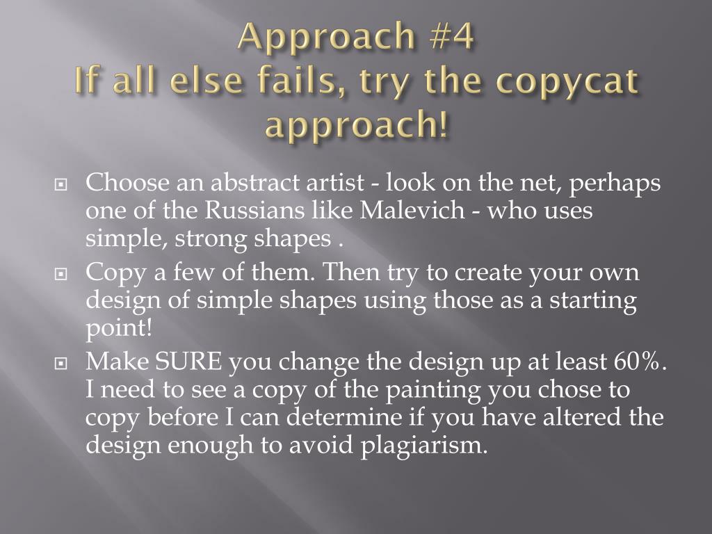 Approach #4If all else fails, try the copycat approach! • Choose an abstract artist - look on the net, perhaps one of the Russians like Malevich - who uses simple, strong shapes . • Copy a few of them. Then try to create your own design of simple shapes using those as a starting point! • Make SURE you change the design up at least 60%. I need to see a copy of the painting you chose to copy before I can determine if you have altered the design enough to avoid plagiarism.