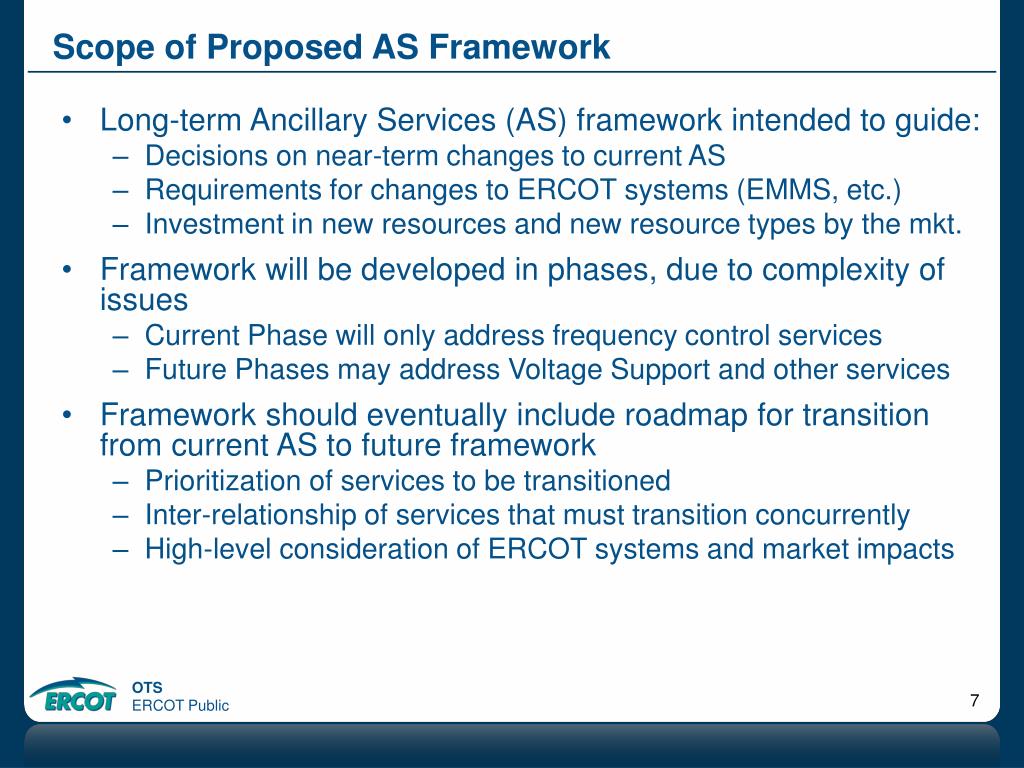 Scope of Proposed AS Framework • Long-term Ancillary Services (AS) framework intended to guide: • Decisions on near-term changes to current AS • Requirements for changes to ERCOT systems (EMMS, etc.) • Investment in new resources and new resource types by the mkt. • Framework will be developed in phases, due to complexity of issues • Current Phase will only address frequency control services • Future Phases may address Voltage Support and other services • Framework should eventually include roadmap for transition from current AS to future framework • Prioritization of services to be transitioned • Inter-relationship of services that must transition concurrently • High-level consideration of ERCOT systems and market impacts