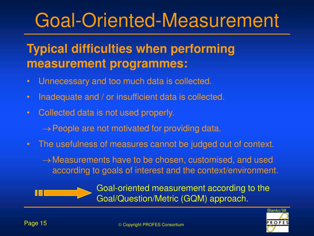 Goal-Oriented-Measurement Typical difficulties when performing measurement programmes: • Unnecessary and too much data is collected. • Inadequate and / or insufficient data is collected. • Collected data is not used properly. • People are not motivated for providing data. • The usefulness of measures cannot be judged out of context. • Measurements have to be chosen, customised, and used according to goals of interest and the context/environment. Goal-oriented measurement according to the Goal/Question/Metric (GQM) approach.