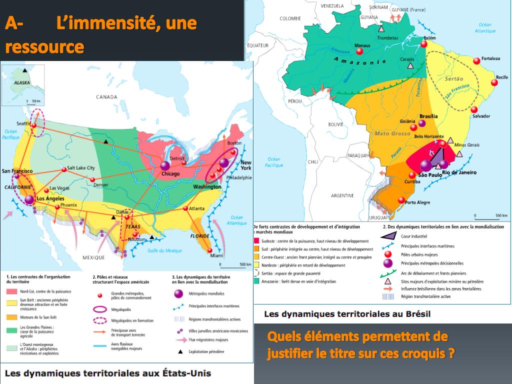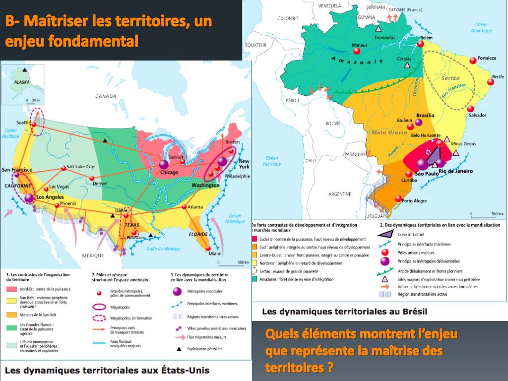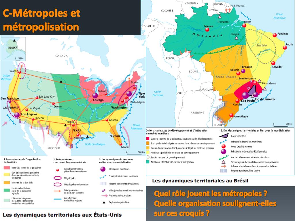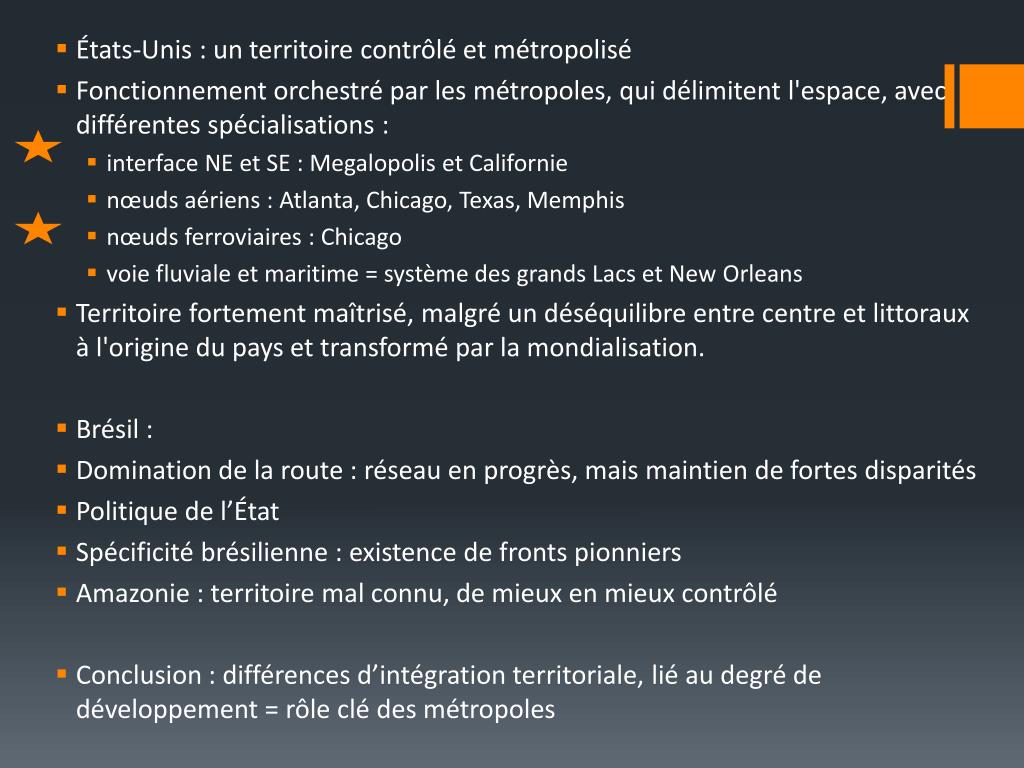 États-Unis : un territoire contrôlé et métropolisé • Fonctionnement orchestré par les métropoles, qui délimitent l'espace, avec différentes spécialisations : • interface NE et SE : Megalopolis et Californie • nœuds aériens : Atlanta, Chicago, Texas, Memphis • nœuds ferroviaires : Chicago • voie fluviale et maritime = système des grands Lacs et New Orleans • Territoire fortement maîtrisé, malgré un déséquilibre entre centre et littoraux à l'origine du pays et transformé par la mondialisation. • Brésil : • Domination de la route : réseau en progrès, mais maintien de fortes disparités • Politique de l’État • Spécificité brésilienne : existence de fronts pionniers • Amazonie : territoire mal connu, de mieux en mieux contrôlé • Conclusion : différences d’intégration territoriale, lié au degré de développement = rôle clé des métropoles