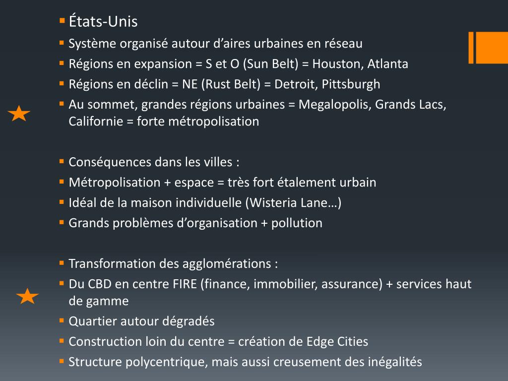 États-Unis • Système organisé autour d’aires urbaines en réseau • Régions en expansion = S et O (Sun Belt) = Houston, Atlanta • Régions en déclin = NE (Rust Belt) = Detroit, Pittsburgh • Au sommet, grandes régions urbaines = Megalopolis, Grands Lacs, Californie = forte métropolisation • Conséquences dans les villes : • Métropolisation + espace = très fort étalement urbain • Idéal de la maison individuelle (WisteriaLane…) • Grands problèmes d’organisation + pollution • Transformation des agglomérations : • Du CBD en centre FIRE (finance, immobilier, assurance) + services haut de gamme • Quartier autour dégradés • Construction loin du centre = création de EdgeCities • Structure polycentrique, mais aussi creusement des inégalités