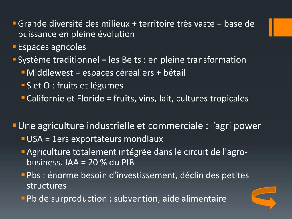 Grande diversité des milieux + territoire très vaste = base de puissance en pleine évolution • Espaces agricoles • Système traditionnel = les Belts : en pleine transformation • Middlewest = espaces céréaliers + bétail • S et O : fruits et légumes • Californie et Floride = fruits, vins, lait, cultures tropicales • Une agriculture industrielle et commerciale : l’agri power • USA = 1ers exportateurs mondiaux • Agriculture totalement intégrée dans le circuit de l'agro-business. IAA = 20 % du PIB • Pbs : énorme besoin d'investissement, déclin des petites structures • Pb de surproduction : subvention, aide alimentaire