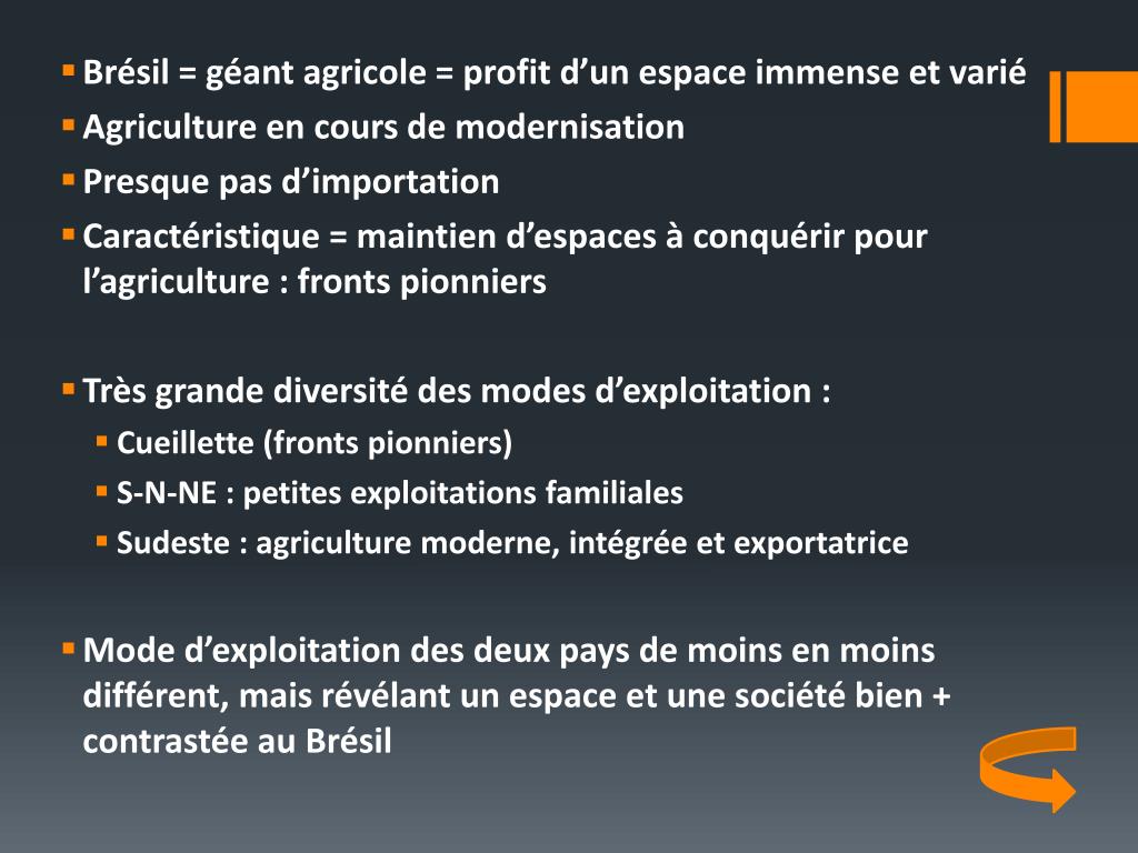 Brésil = géant agricole = profit d’un espace immense et varié • Agriculture en cours de modernisation • Presque pas d’importation • Caractéristique = maintien d’espaces à conquérir pour l’agriculture : fronts pionniers • Très grande diversité des modes d’exploitation : • Cueillette (fronts pionniers) • S-N-NE : petites exploitations familiales • Sudeste : agriculture moderne, intégrée et exportatrice • Mode d’exploitation des deux pays de moins en moins différent, mais révélant un espace et une société bien + contrastée au Brésil
